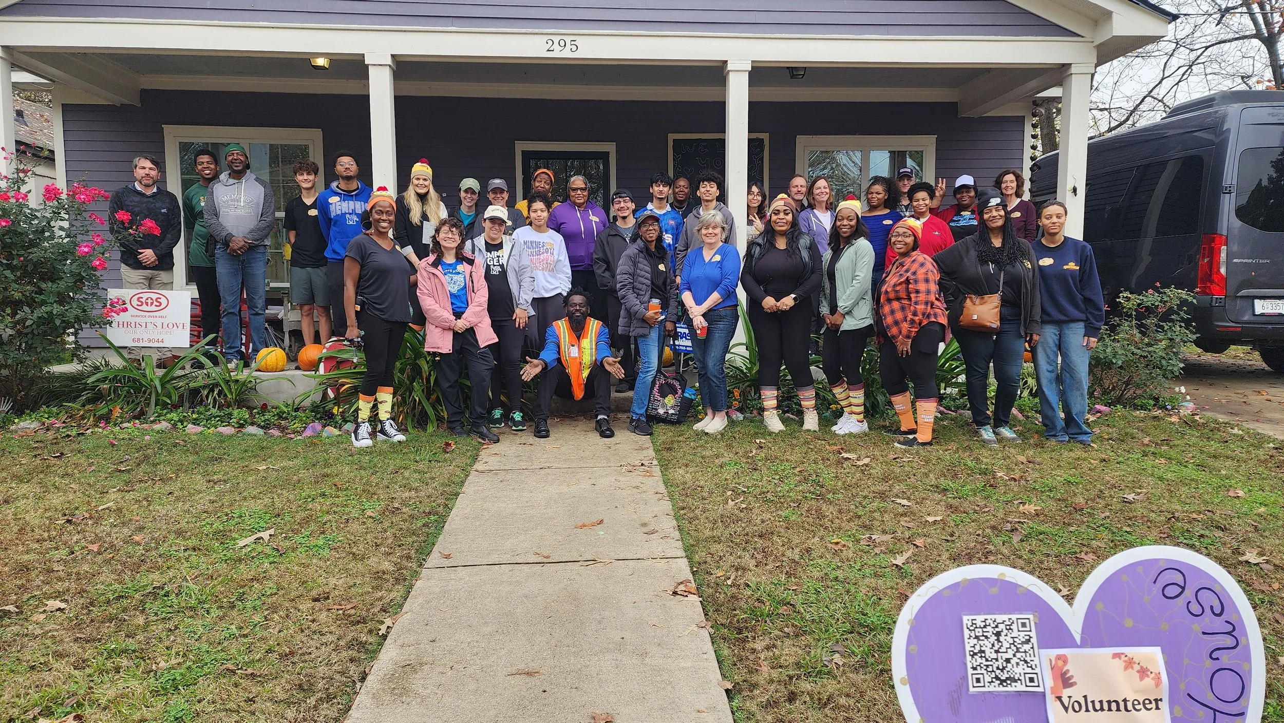 More than 30 Turkey Give Away volunteers assemble in front of the Carpenter Art Garden Purple House